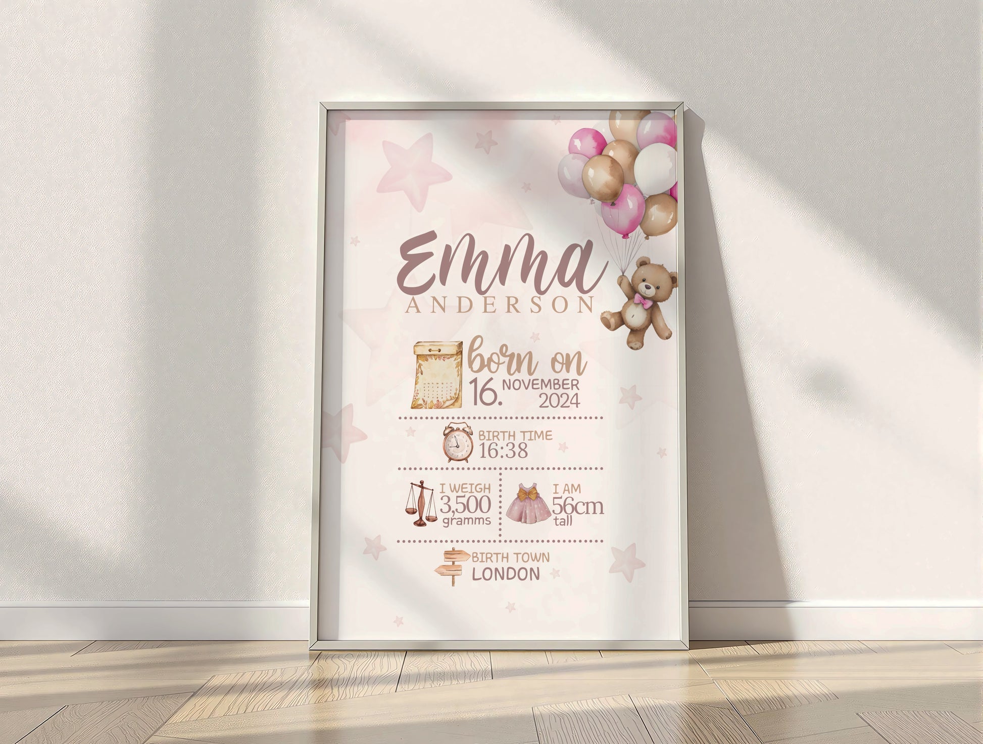 Celebrate your baby’s arrival with a beautiful, custom-designed birth print. This personalized digital poster features your newborn’s name, birth date, time, weight, length, and birth location in a charming, timeless style.